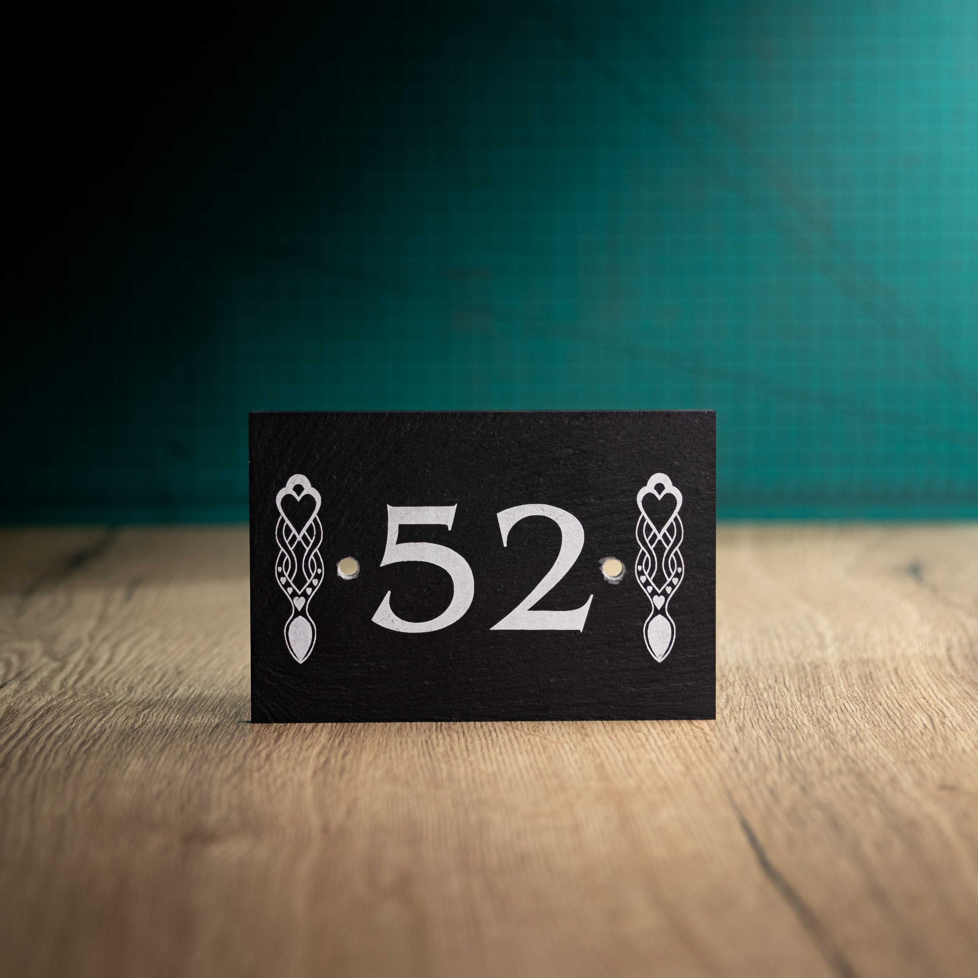 The surface is finished in a smooth black coating and laser-engraved with your house number, framed by two intricately detailed Welsh lovespoons, a classic symbol of love and warmth. This elegant design blends traditional Welsh culture with modern laser precision, creating a plaque that’s both meaningful and long-lasting.